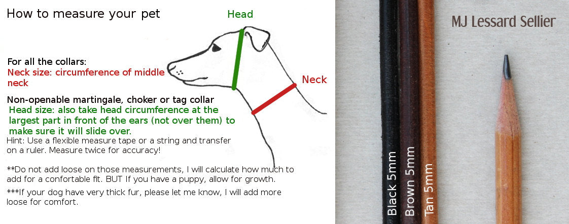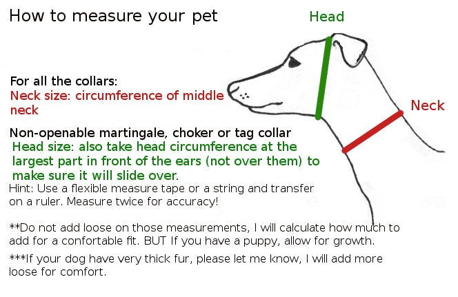 Take the exact measurement of the dog head just in front of the ears and also measure the middle neck. Do not add loose, i will make it to fit right. Give me those two measurements in the personalization box. **If your dog have very thick fur, please let me know so I will add more loose on the collar for a comfortable fit. ***If you have a PUPPY, I recommend to wait until the dog be almost adult or you might want to refer to an adult parent for a guesstimation at your own risk.
